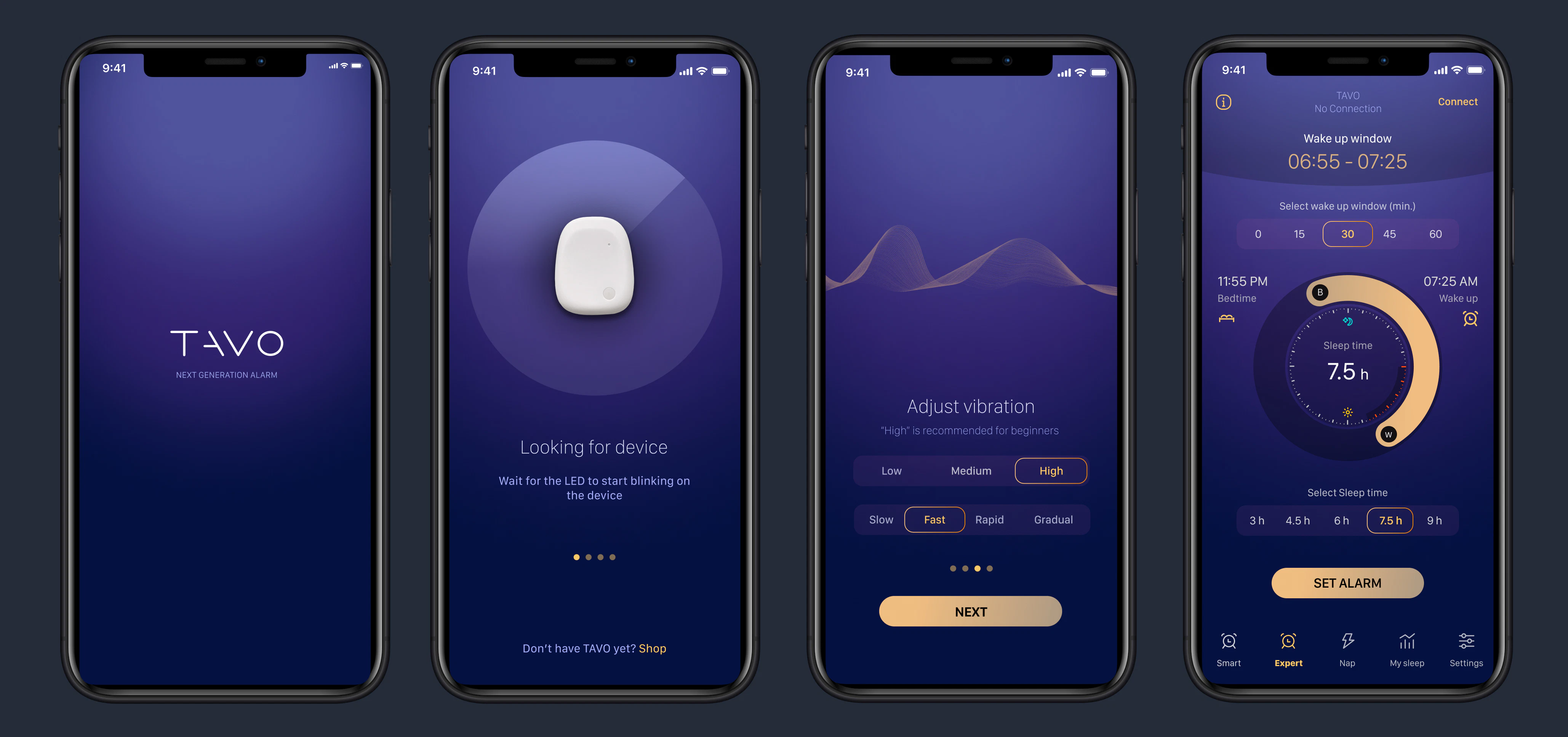 TAVO (USA) - monitors and analyzes users' sleep movement. It recognizes when you are in different sleep stages. It is designed to wake you up in light sleep when your body is most ready for a wake-up.