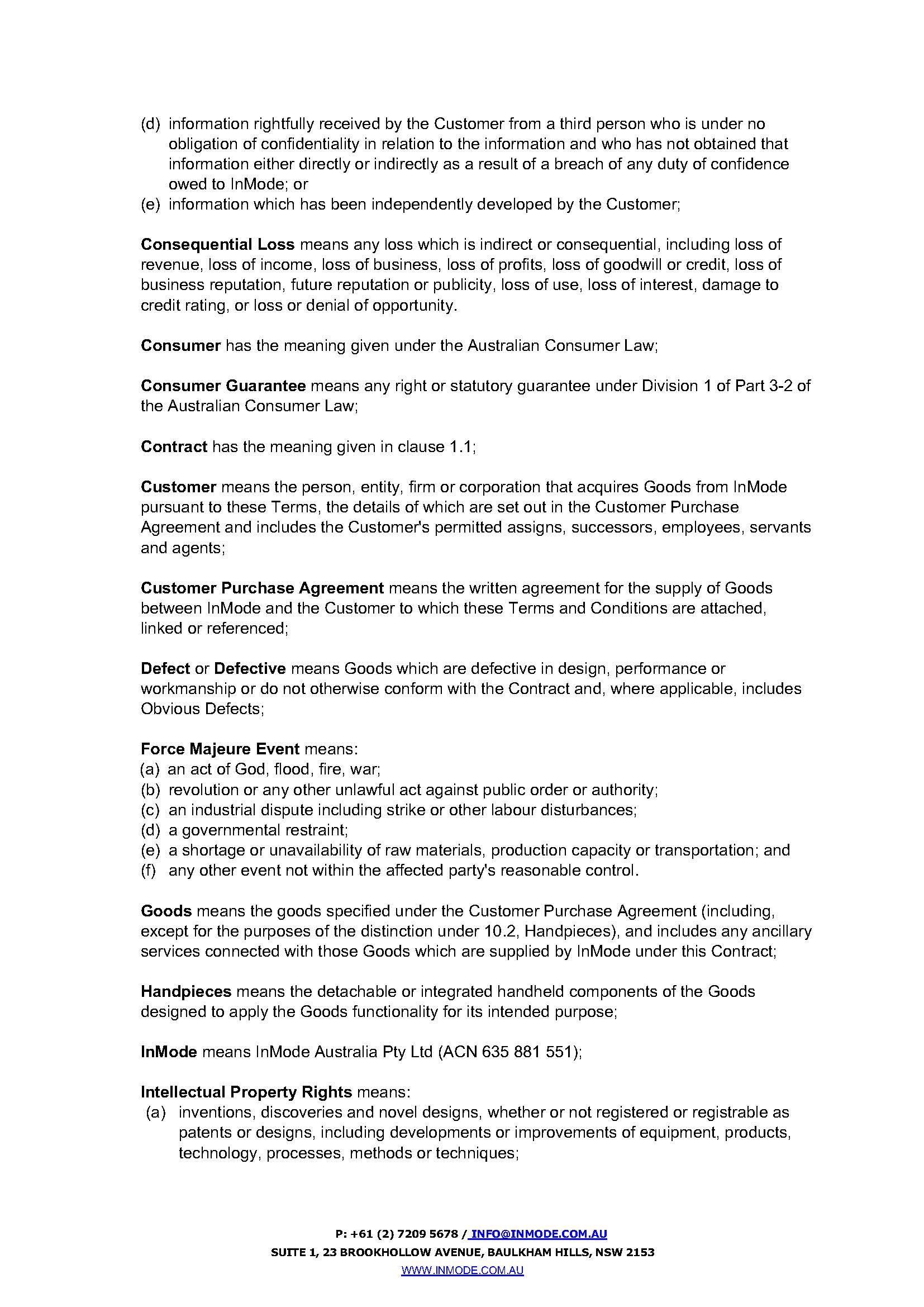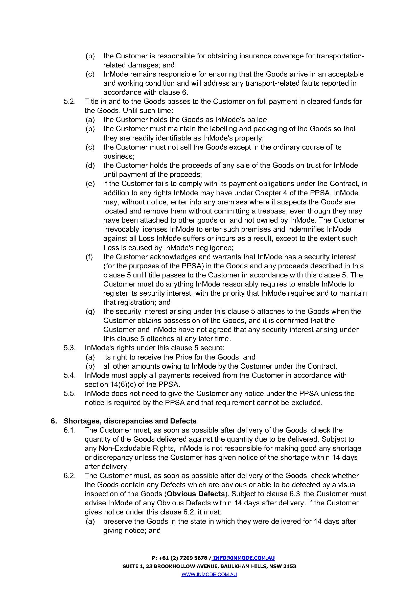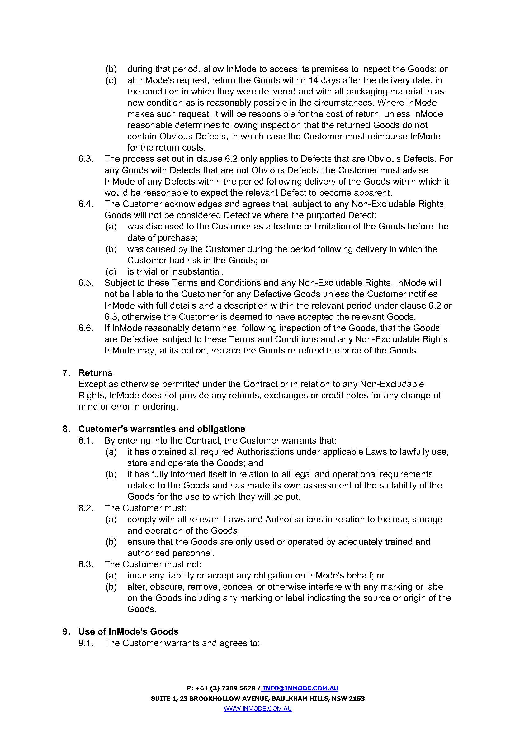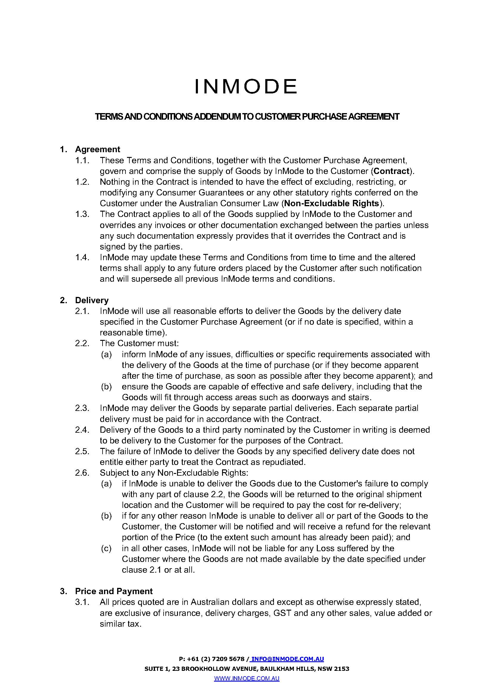 Marketing Kit: Printed and electronic marketing material support (www.inmode.com.au) Including: • Patient brochures and print-ready files. • Waiting room video, web and media files • Purpose of supply. InMode Australia provides clinical assets, including but not limited to images and videos for professional education and in-clinic consultation only. They are not authorised for advertising a regulated health service unless you independently confirm compliance with AHPRA’s advertising guidelines and the National Law. Advertising use - If you publish any InMode asset, you are responsible for ensuring full compliance with applicable requirements, including: (a) no testimonials or influencer ‘success stories’; (b) no content that is false, misleading or likely to create unrealistic expectations; and (c) adherence to any profession-specific guidance (including cosmetic surgery and higher-risk non-surgical cosmetic procedures). Other laws may also apply (e.g., TGA advertising rules and Australian Consumer Law). InMode does not approve, endorse or assume responsibility for your advertising. Obtain and retain written patient consent for any identifiable imagery. | | | |