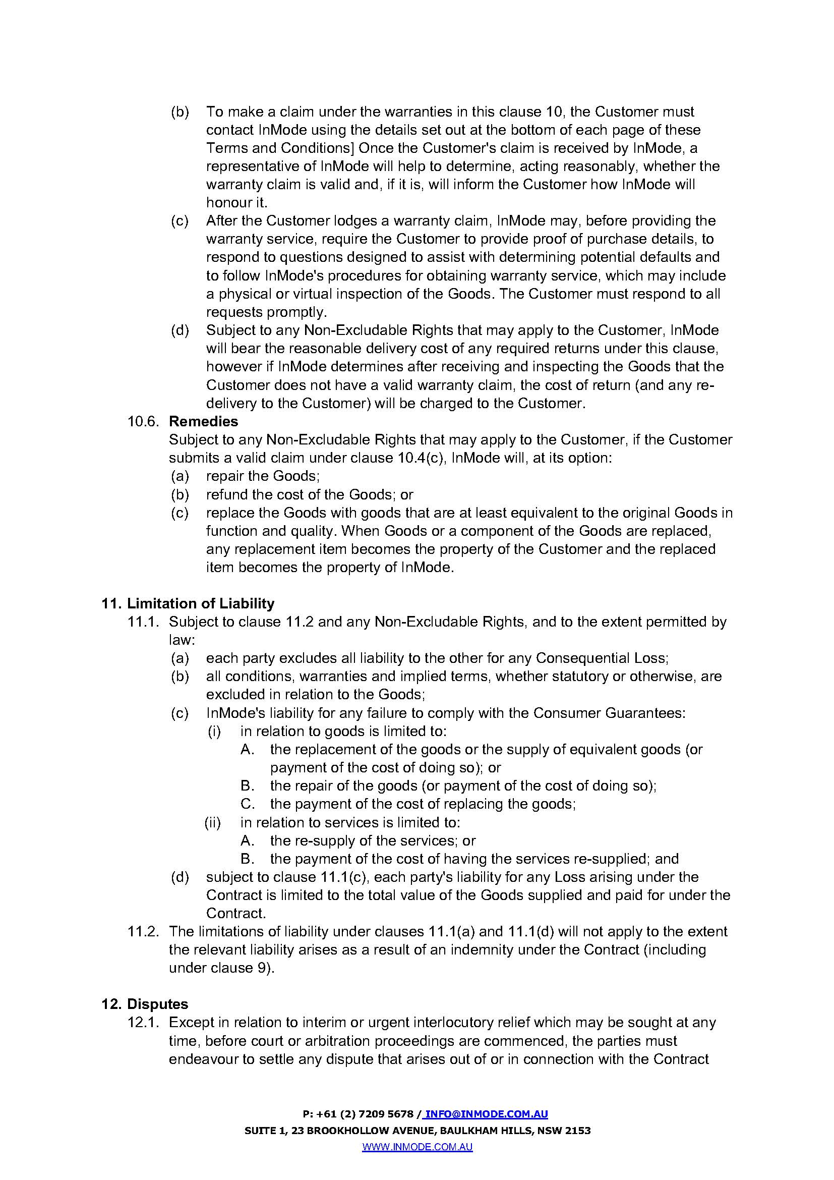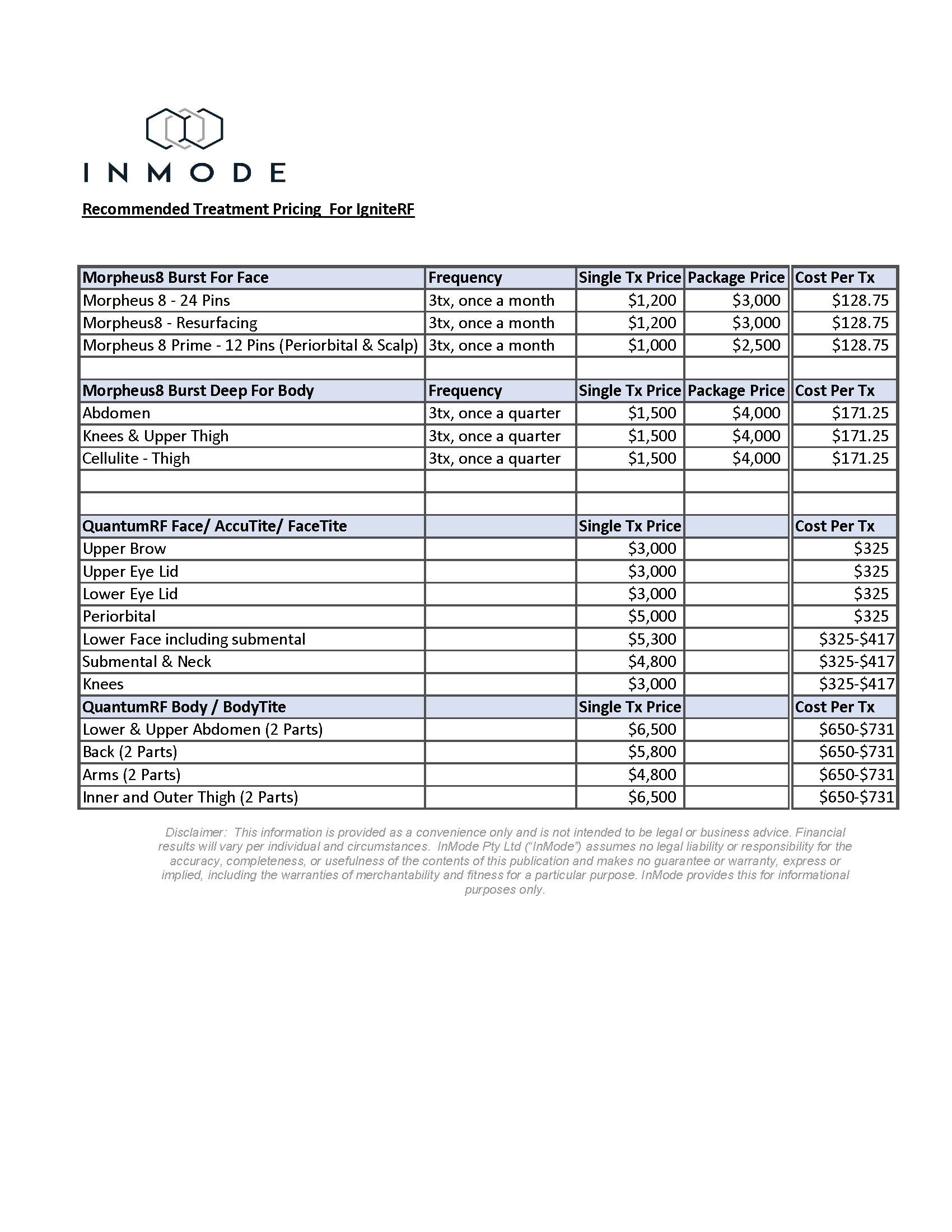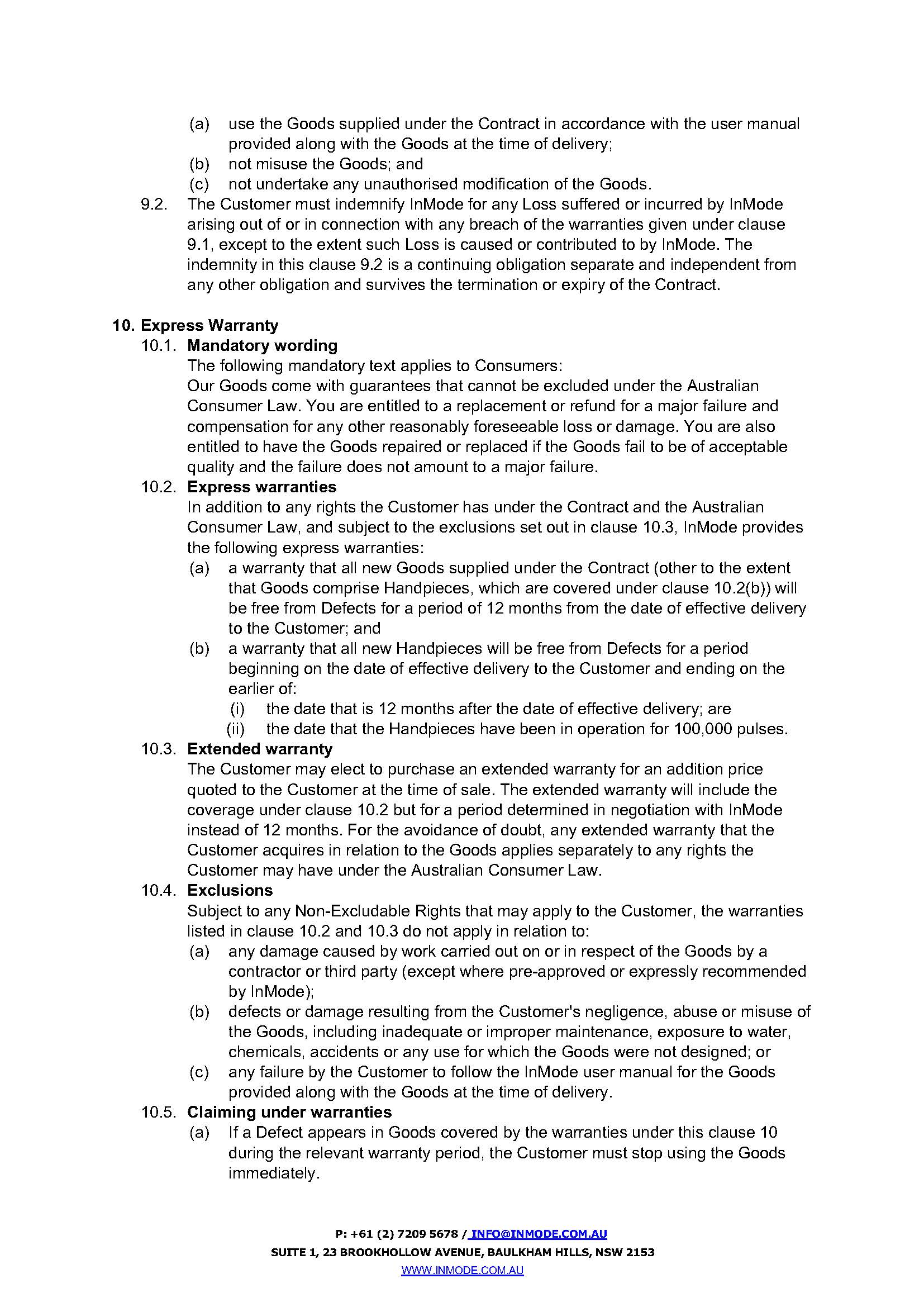 Marketing Kit: Printed and electronic marketing material support (www.inmode.com.au) Including: • Patient brochures and print-ready files. • Waiting room video, web and media files • Purpose of supply. InMode Australia provides clinical assets, including but not limited to images and videos for professional education and in-clinic consultation only. They are not authorised for advertising a regulated health service unless you independently confirm compliance with AHPRA’s advertising guidelines and the National Law. Advertising use - If you publish any InMode asset, you are responsible for ensuring full compliance with applicable requirements, including: (a) no testimonials or influencer ‘success stories’; (b) no content that is false, misleading or likely to create unrealistic expectations; and (c) adherence to any profession-specific guidance (including cosmetic surgery and higher-risk non-surgical cosmetic procedures). Other laws may also apply (e.g., TGA advertising rules and Australian Consumer Law). InMode does not approve, endorse or assume responsibility for your advertising. Obtain and retain written patient consent for any identifiable imagery. | | | |