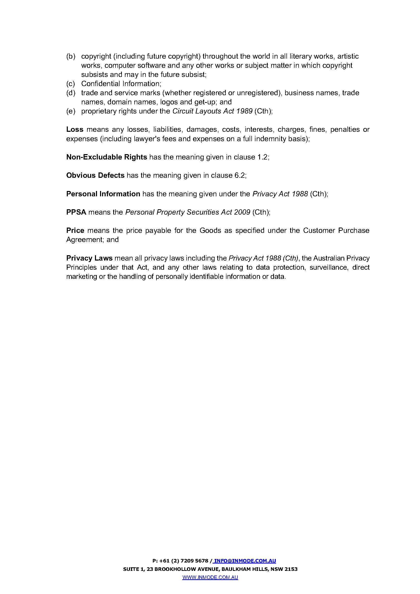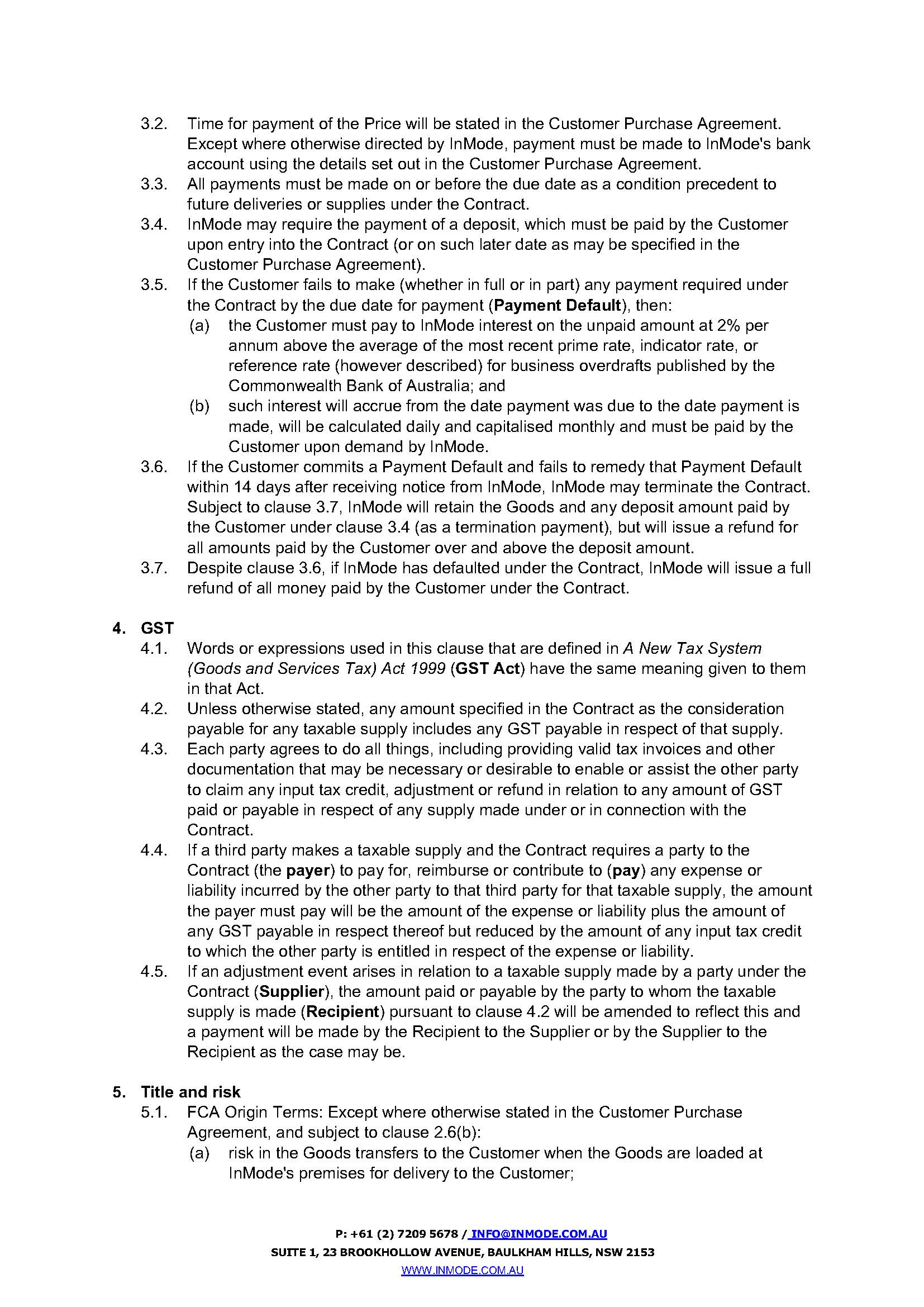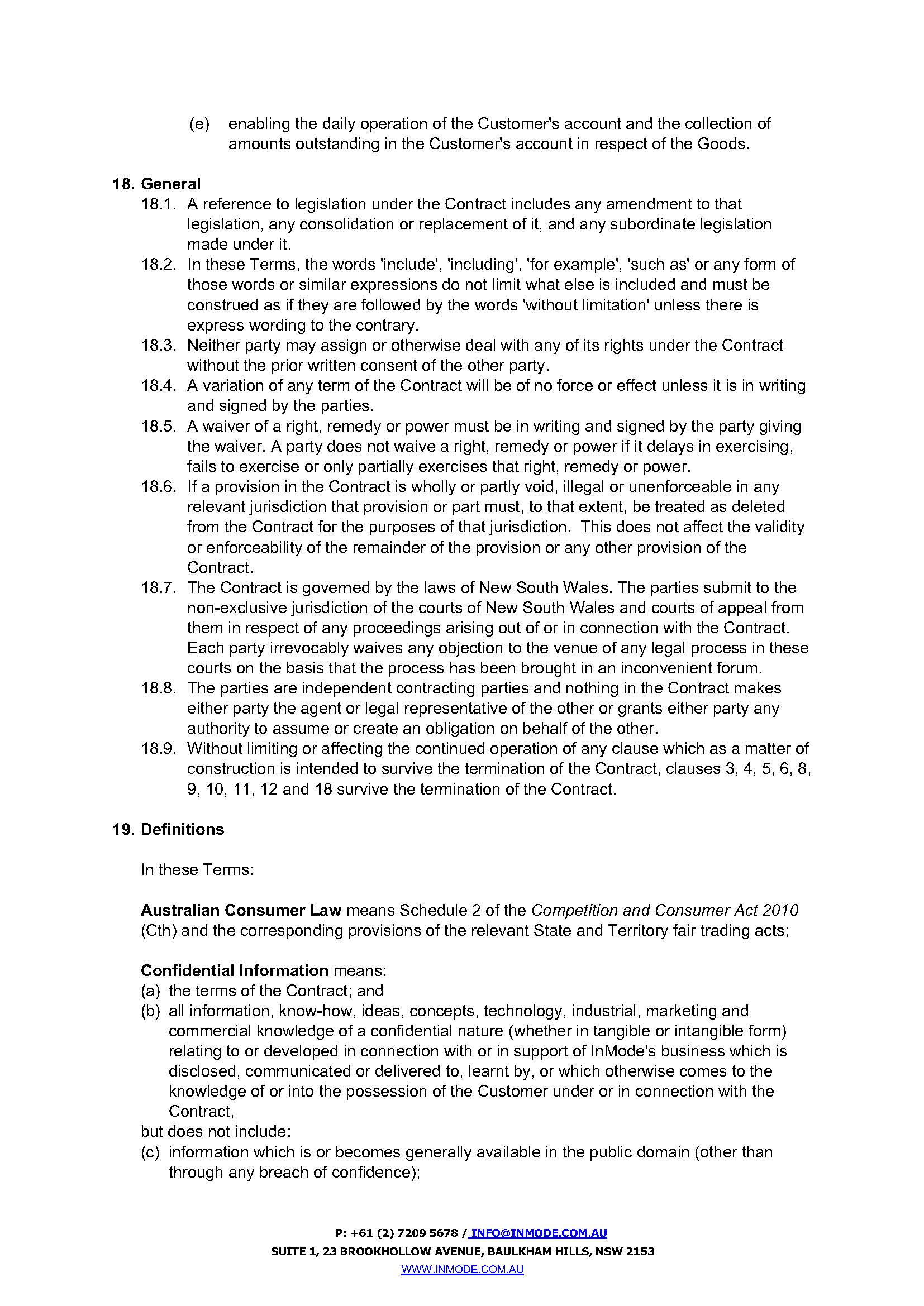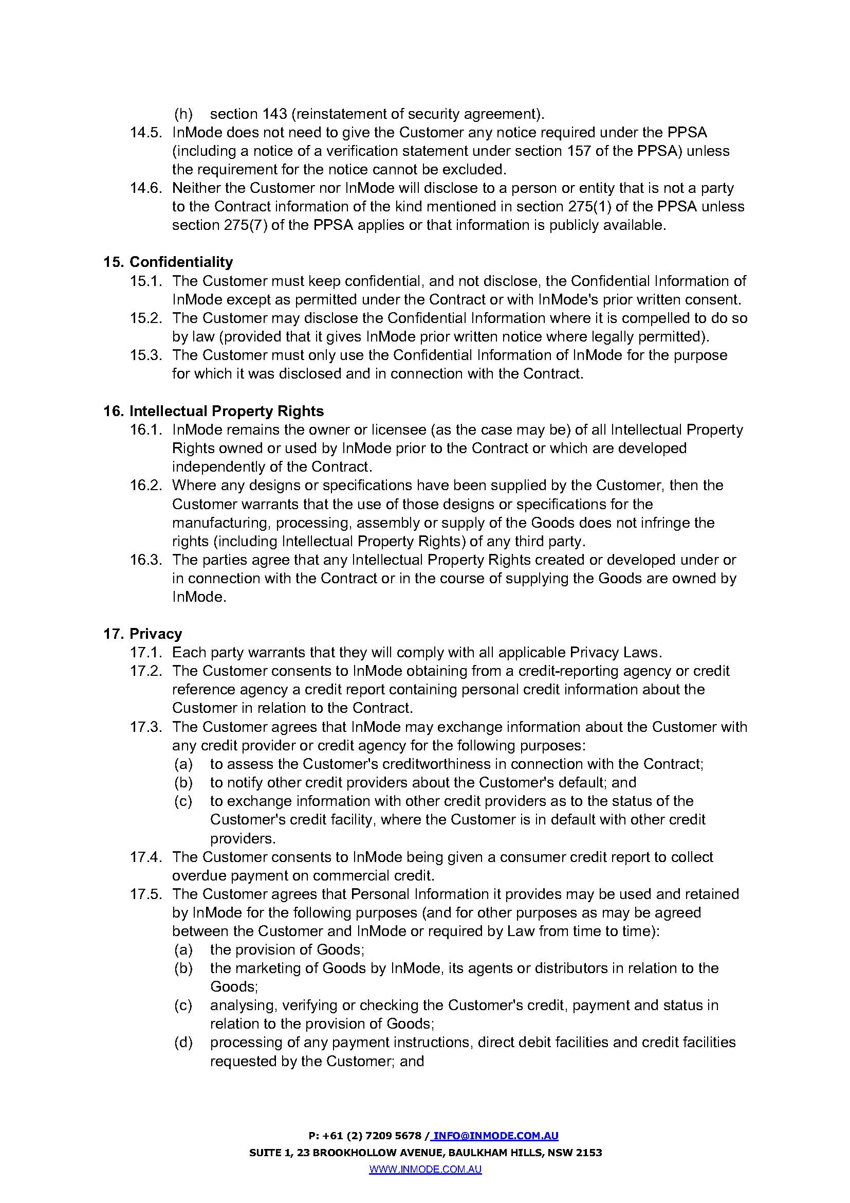Marketing Kit: Printed and electronic marketing material support (www.inmode.com.au) Including: • Patient brochures and print-ready files. • Waiting room video, web and media files • Purpose of supply. InMode Australia provides clinical assets, including but not limited to images and videos for professional education and in-clinic consultation only. They are not authorised for advertising a regulated health service unless you independently confirm compliance with AHPRA’s advertising guidelines and the National Law. Advertising use - If you publish any InMode asset, you are responsible for ensuring full compliance with applicable requirements, including: (a) no testimonials or influencer ‘success stories’; (b) no content that is false, misleading or likely to create unrealistic expectations; and (c) adherence to any profession-specific guidance (including cosmetic surgery and higher-risk non-surgical cosmetic procedures). Other laws may also apply (e.g., TGA advertising rules and Australian Consumer Law). InMode does not approve, endorse or assume responsibility for your advertising. Obtain and retain written patient consent for any identifiable imagery. | | | |