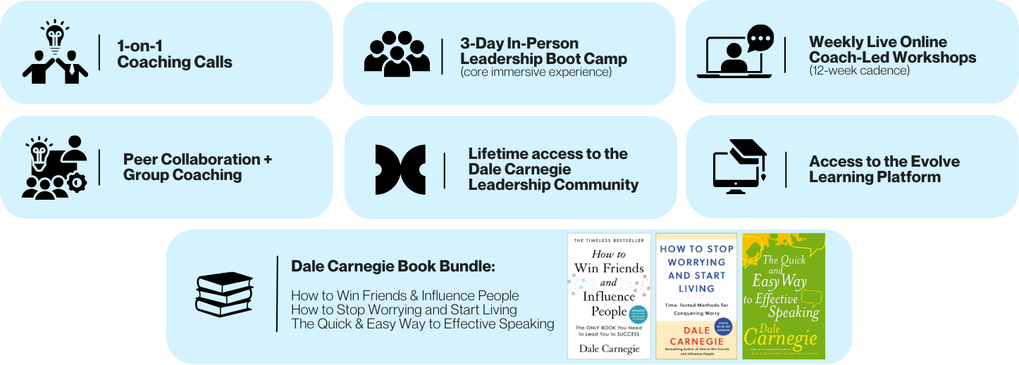 In these conversations we will refine the plan, deepen understanding to create alignment, energy and momentum. The Dale Carnegie Coach will point to areas of focus in the Leadership Boot Camp and online Leadership Lab.