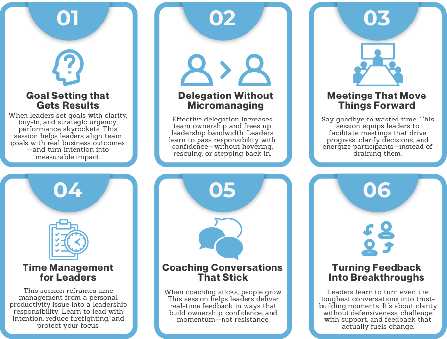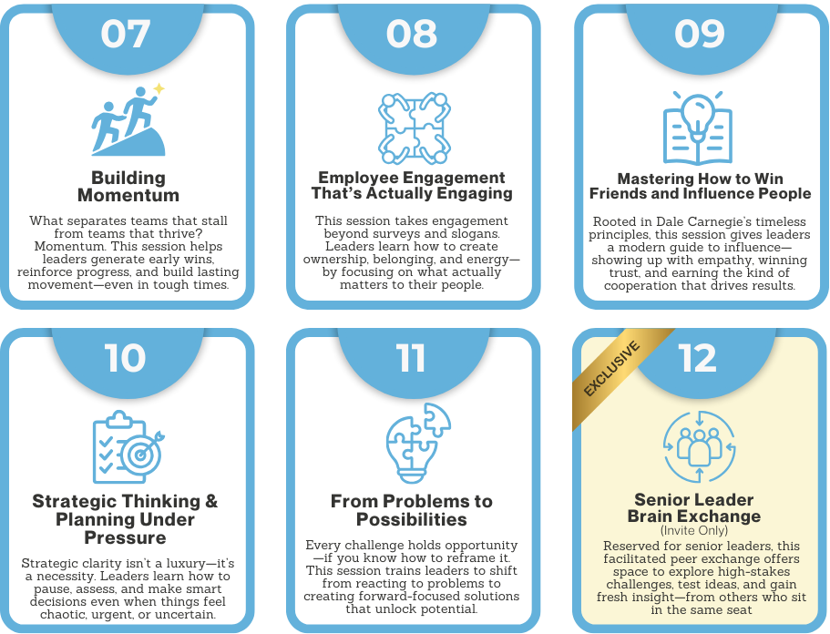 These sessions go deeper on the real-world challenges leaders face every day—coaching, time pressure, strategic planning, engagement, and influence. Each session builds a specific leadership muscle that, when developed, makes leading simpler, more effective, and more rewarding.