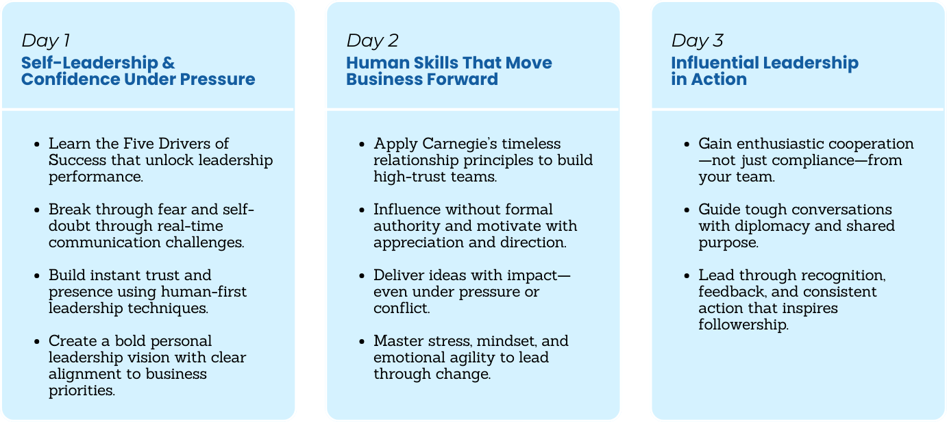 Over three high-energy, practical, and transformational days, participants experience the globally proven Dale Carnegie Immersion—a hands-on leadership journey rebuilt for today’s business realities.