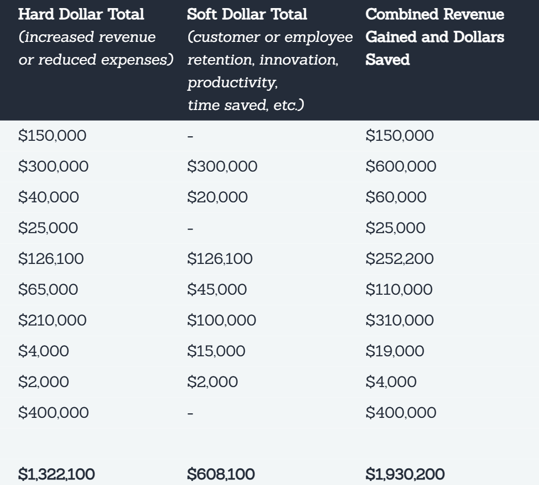 We track hard & soft dollar ROI, confidence growth, and behavioral change.