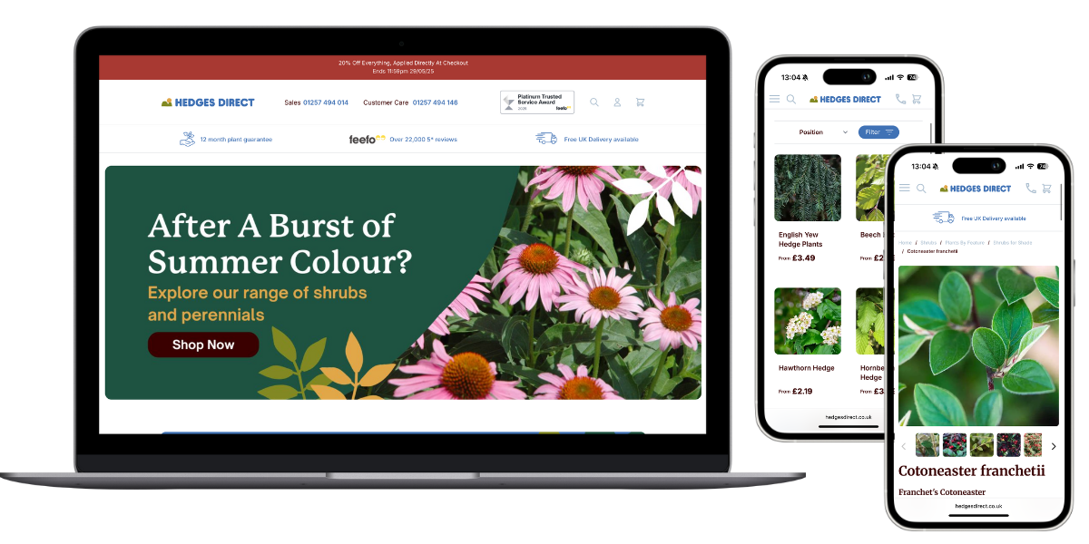 Hedges Direct is one of the UK’s leading online hedge and plant retailers. With thousands of SKUs and a highly seasonal sales cycle, they needed a high-performing e-commerce platform that could flex with demand and deliver a smooth customer experience.