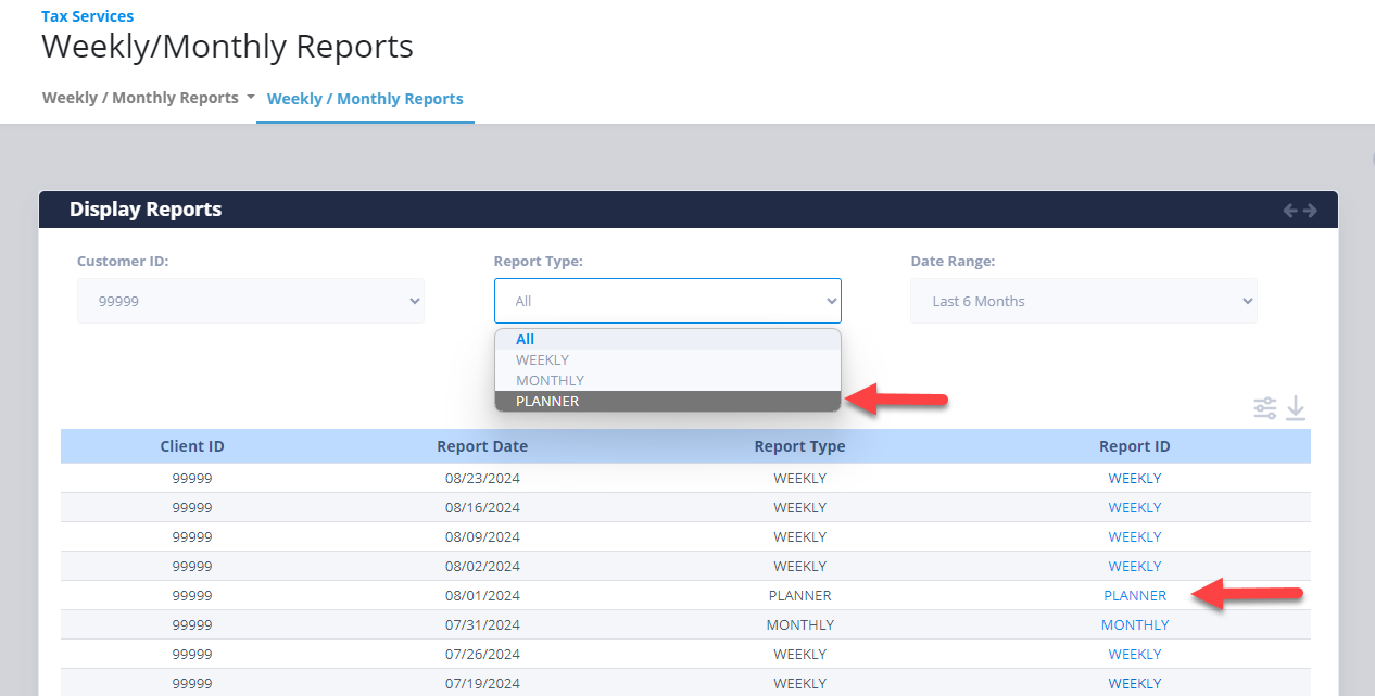 To access the planner, Tax Services > Weekly/Monthly Reports > Select Planner from the Report Type dropdown or choose it from the report list.